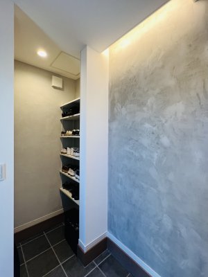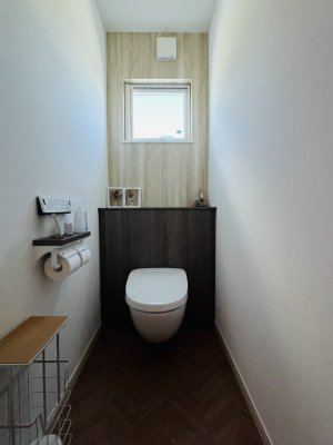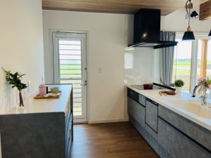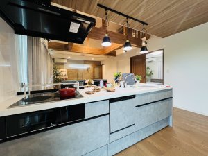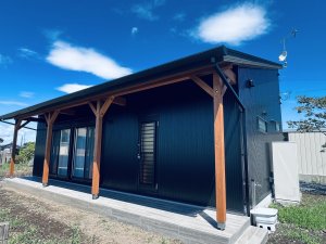 ガルバリウム鋼板の屋根と外壁のブラックがクールでありながら、木目調の軒天や玄関ドア、テラスの木柱等を取り入れ、ナチュラルな雰囲気のあるお家です。