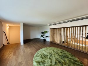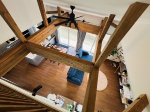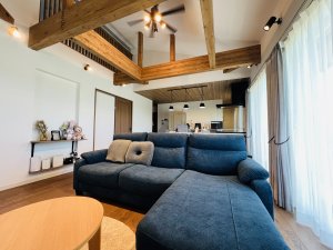 勾配天井のリビングは開放感があり、表し梁でデザイン性を高めています。大きな窓を採用し、ロフトからの眺めは癒される時間となりそうです。広々とした空間でご家族様も家族の一員であるワンちゃんも穏やかに過ごせるお家です。