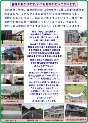 おかげ様でギャブハウス真岡の日光建設(株)は令和6年12月に創業45周年を迎えました。