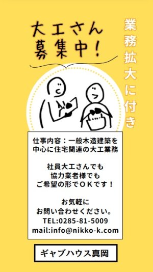 建築士(設計)さん、現場監督さん、大工さん、作業員さんの正社員募集です。